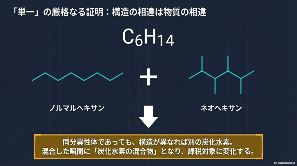 「単一の炭化水素」とは、分子構造を同じくする炭化水素のみからなるものをいい、不純物又は添加剤等を含有するものもこれに含めて取り扱う。したがつて、例えばノルマルヘキサンとネオヘキサン(2.2-ジメチルブタン)とは、その分子式はC6H14と同一であつても、その構造式はCH3-(CH2)4-CH3及び(CH3)3C-CH2-CH3とそれぞれ異なつているから、これらの混合物は、原則として単一の炭化水素には該当しないことに留意する。(昭59間消4-72改正)