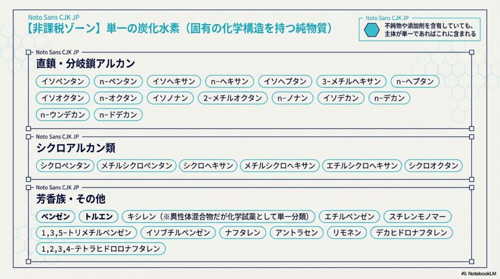 → 純度100%のベンゼンやトルエンなどは、揮発油税法の本来の「炭化水素油」には該当しません、と明言しています。