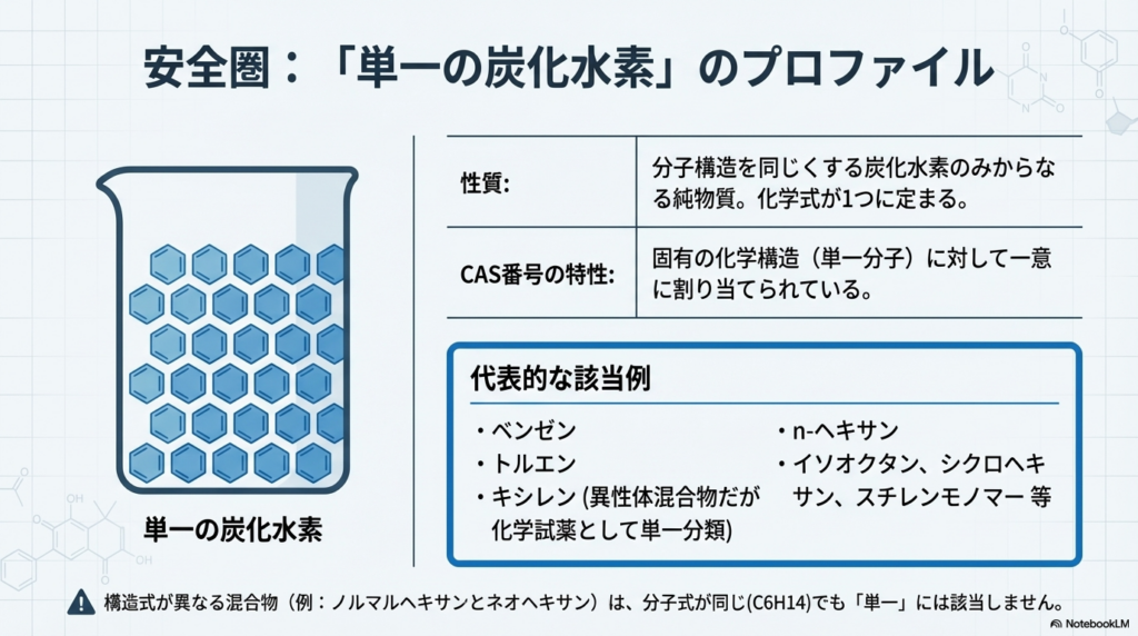 「単一の炭化水素」とは、純度100%のベンゼンやトルエンといった、特定の純粋な化学物質のことです。