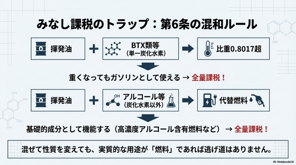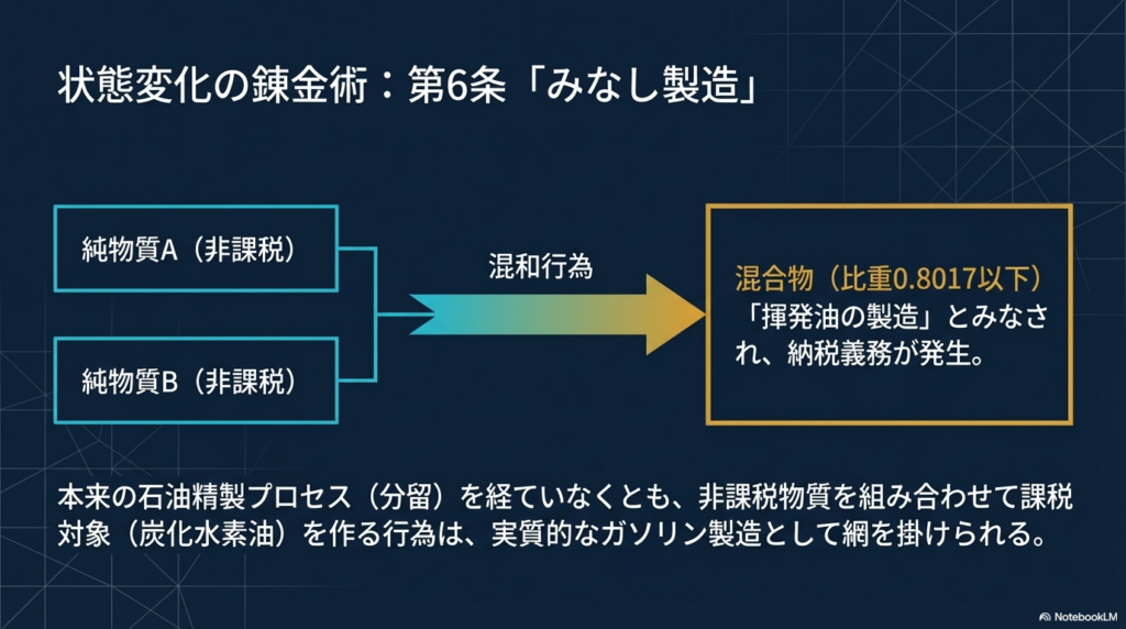「抜け道防止」のルールです。 ある油と何かを混ぜて、法律上「みなし揮発油(ガソリンとみなして課税される油)」が出来上がったとします。