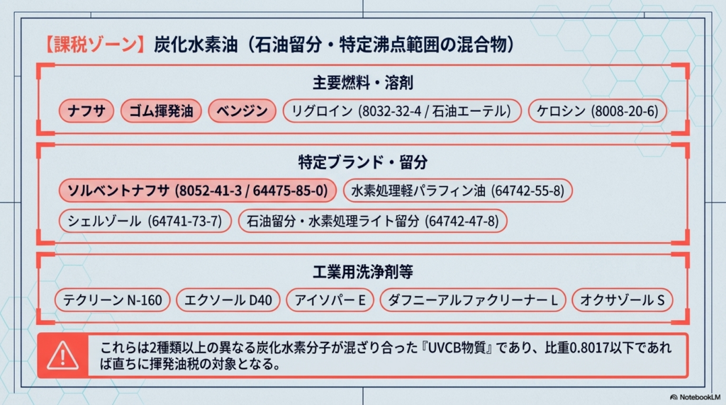 **「常温常圧(15度・1気圧)で液体の、炭化水素を含んでいるもの全般」**です。 純粋な炭化水素だけでなく、不純物や他の物質(アルコールなど)が混ざっていても、全体として液体であれば「炭化水素油」というグループに入れます。ガソリン、灯油、軽油などはもちろん、これらに別の何かを混ぜた液体もすべてここに含まれます。