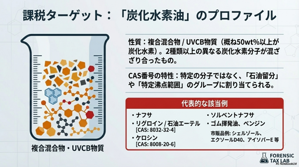 ・炭化水素油のCAS番号は「石油留分」や「特定沸点範囲の混合物」というグループに対して割り当てられています。