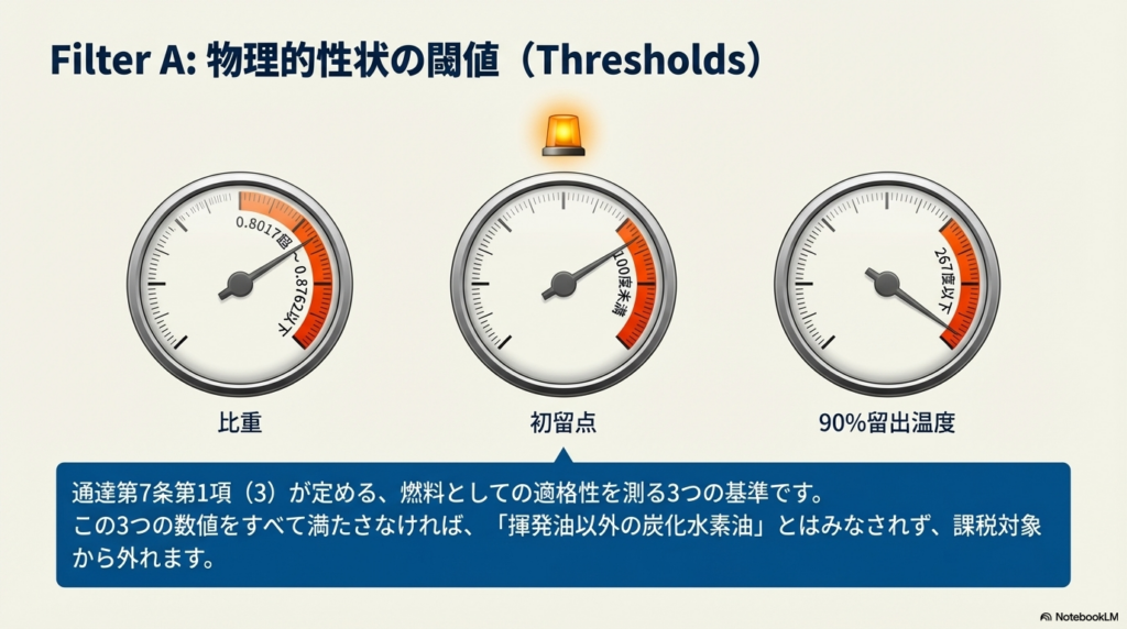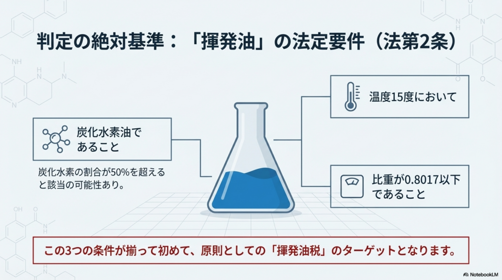 この項では、そもそもどういう状態の液体になれば「性状及び用途が揮発油に類するもの(=実質的にガソリンと同じように使えるもの)」と判断して課税するのか、という客観的な条件を定義しています。