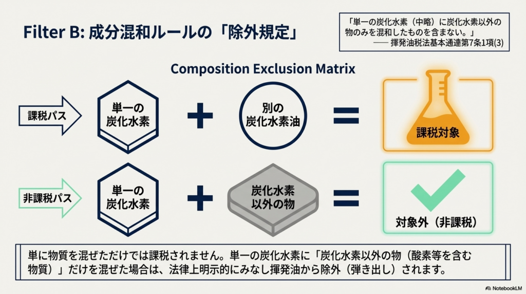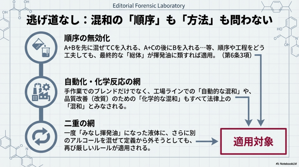 「AとBを先に混ぜてからCを入れる」「AとCを先に混ぜてからBを入れる」など、混ぜる順番や工程をどう工夫しても関係ありません。 最終的に出来上がった全体(総体)が「揮発油に類するもの」であれば、出来上がった全体に対して法第6条が適用され、まとめて課税されます。