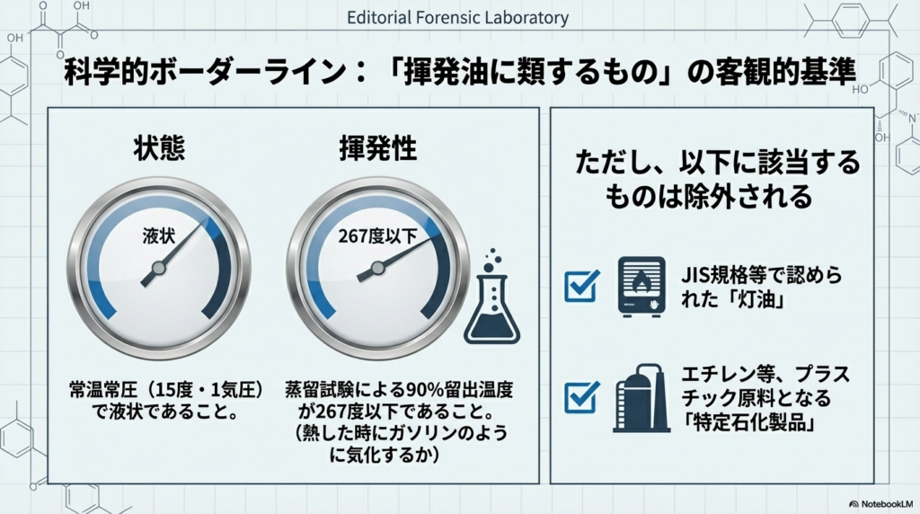 **「限りなくガソリンに近い性質を持った油(重質の油など)」**を数値で厳密に定義しています。 以下の3つの条件をすべて満たすものが該当します。