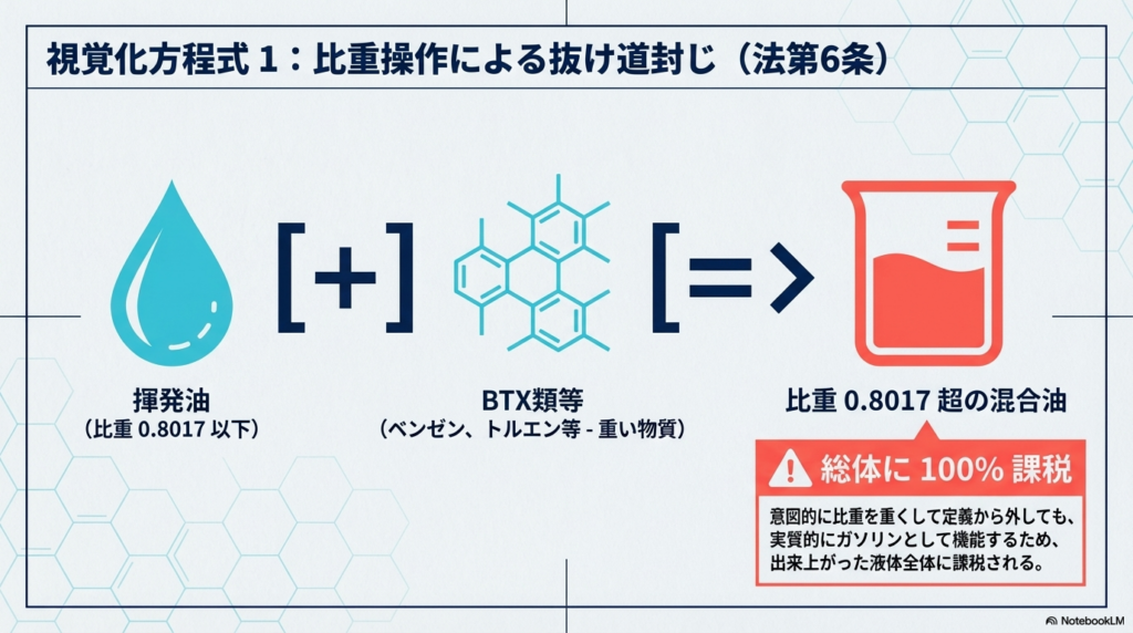 法律で「AとBを混ぜたら課税する」と決めた場合、「いや、私たちが手作業で混ぜたわけじゃなく、工場の機械が自動で処理しただけです」とか、「品質を良くするため(改質)に化学反応させただけです」と言い逃れをする業者が出てくる可能性があります。