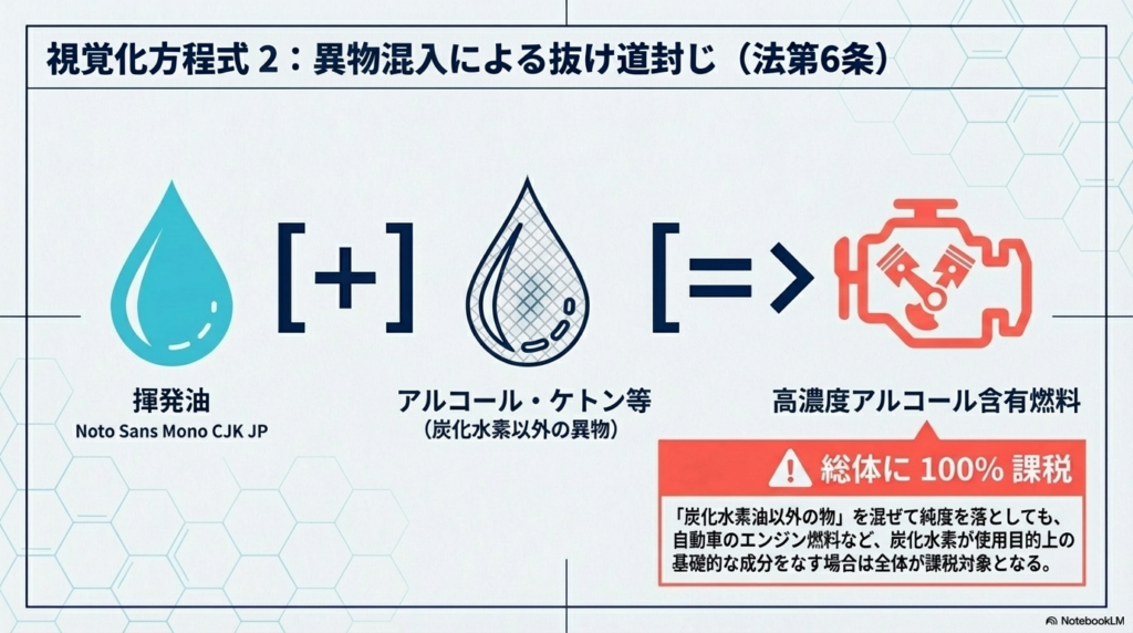 → アルコールなどの不純物が混ざった時点で、揮発油税法の本来の「炭化水素油」からは外れます、と明言しています。
