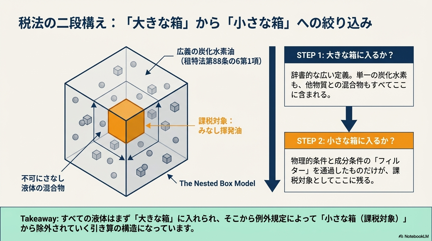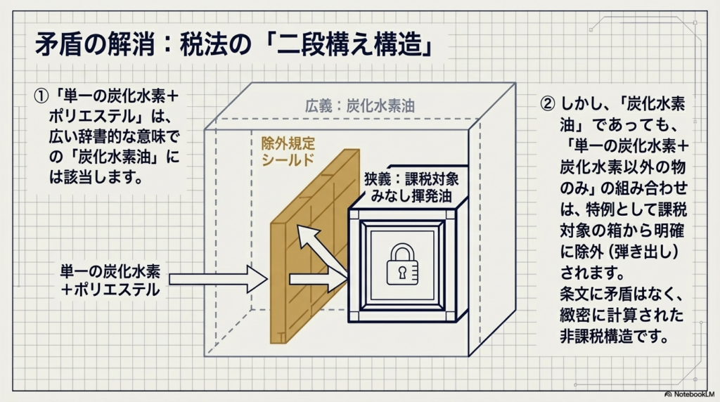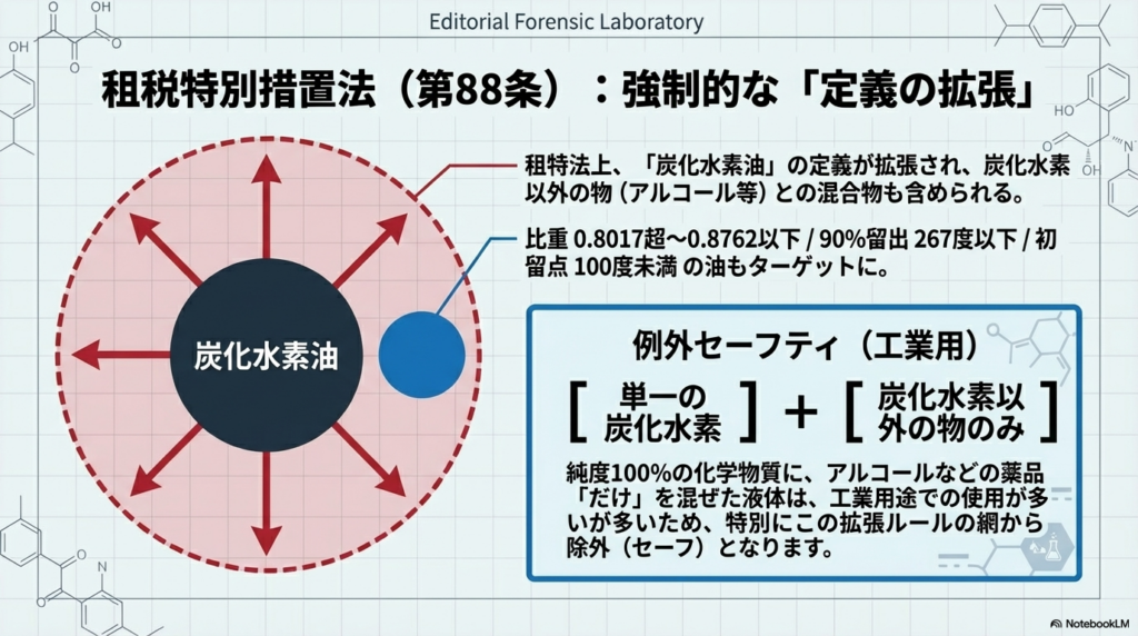そこで、租特法(第88条の6「みなし揮発油等の特例」など)という特別ルールを上書きして、「租特法の上では、単一のものや他の物が混ざったものも『含む』こととする!」と、あえて法律の適用範囲を拡張(書き分け)しているのです。